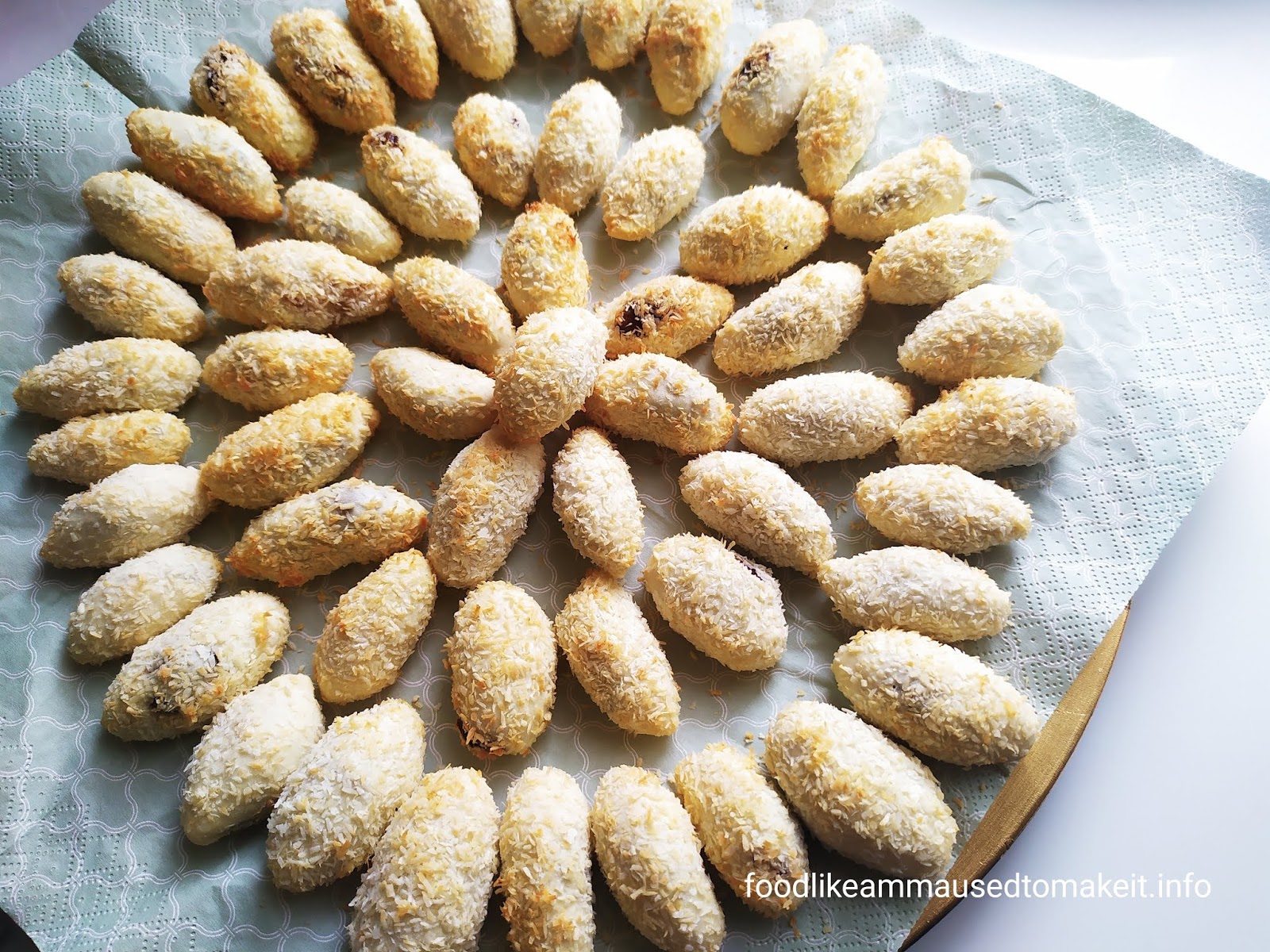 Once all dates have been wrapped in a blanket of dough. Dip in milk then coconut with coconut