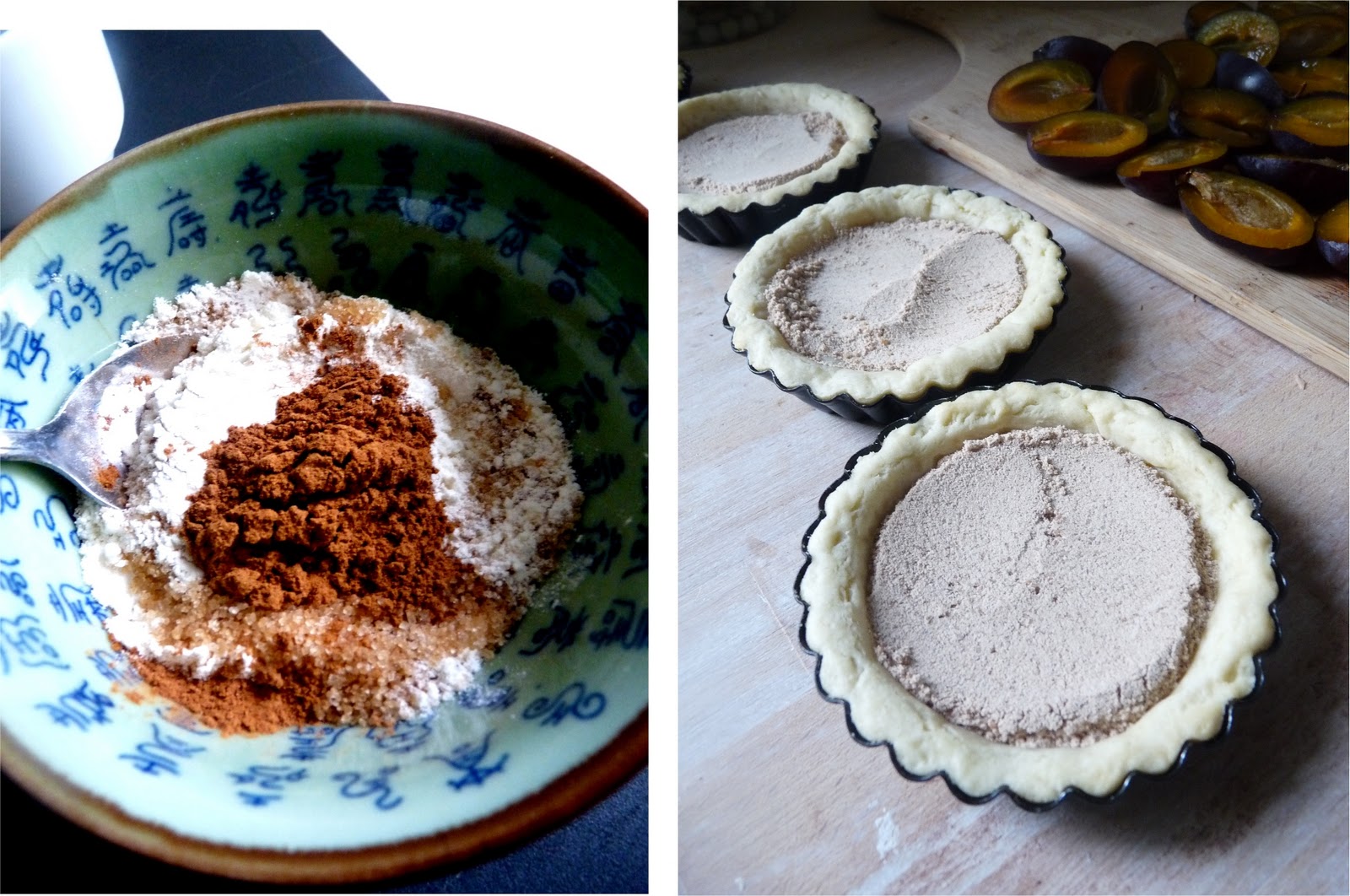 10. Add cinnamon sugar mixture into tart shells. Place Plums in tart.