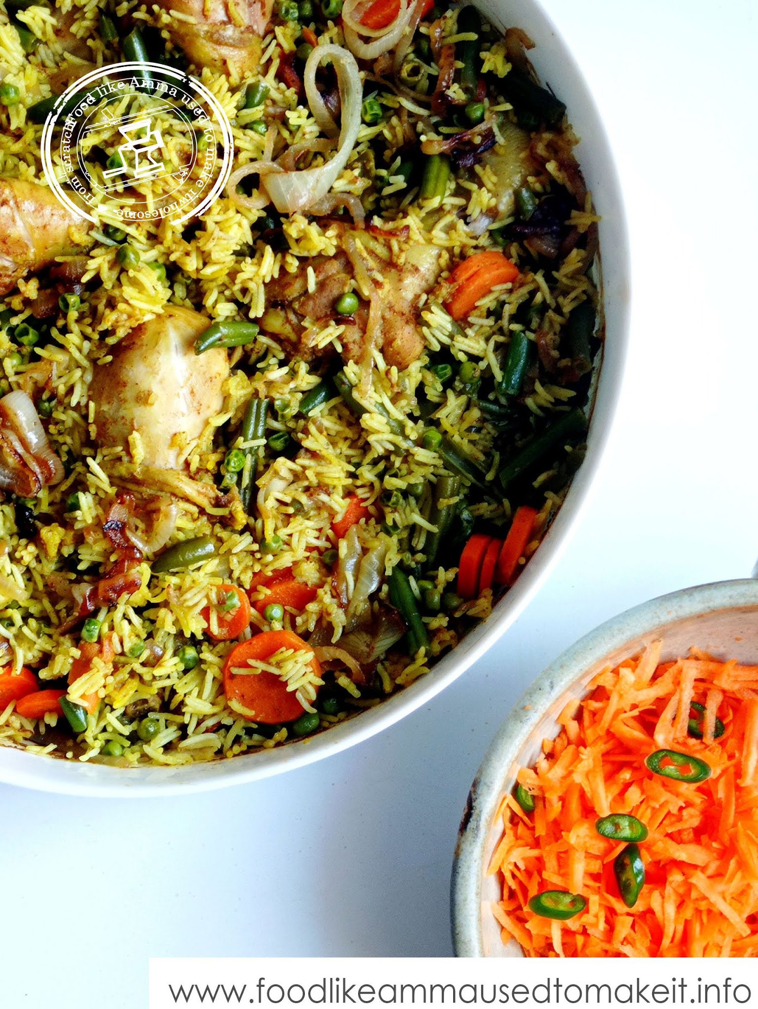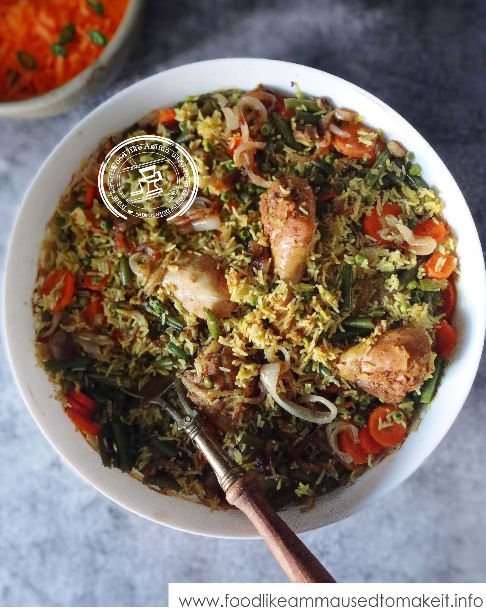 Biryani (Briyani) is a slow cooked dish prepared by infusing rice and or vegetables and meat with spices to form a mild yet fragrant composition. Prepared in kitchens from across Persia to South Asia and in South Africa too,the preparation of biryani differs in both the use of ingredients and cooking techniques. Biryani was usually one of our Sunday lunch meals . Amma used turmeric or food coloring to color the rice and often made biryani milder than she did Curries and used biryani dhal (black lentils) which I have omitted from this recipe. She often made mutton biryani, chicken biryani or vegetable biryani. She rarely made fish biiryani while her tinfish biryani sometimes featured on the menu for weekday lunches.