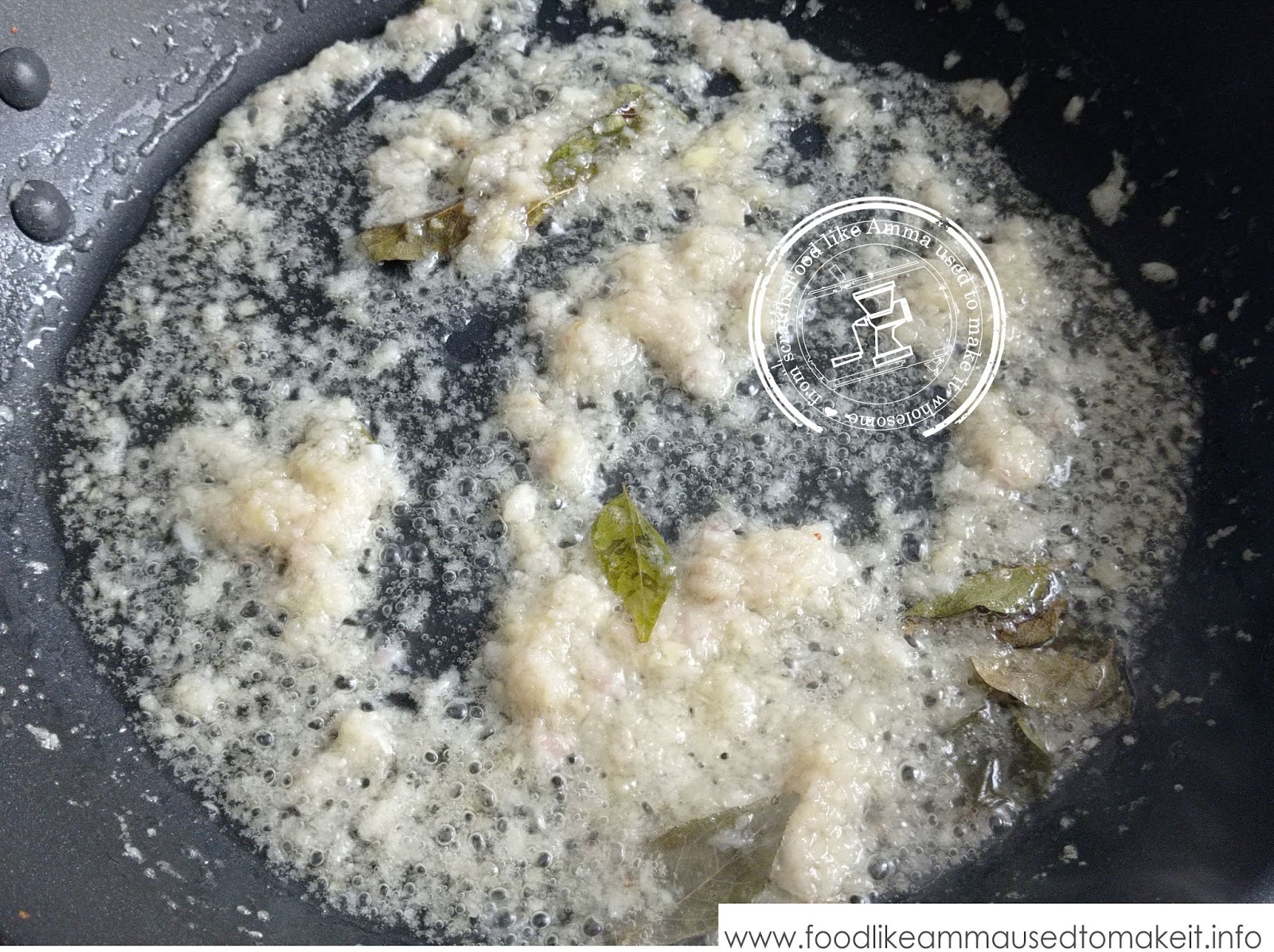 - Add oil to pan. Fry finely sliced onion and ginger and garlic and curry leaves until the onions are soft.